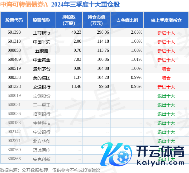 中海可转债债券A为债券型-搀杂二级基金,把柄最新一期基金季报流露,该基金财富建设:股票占净值比8.94%,债券占净值比95.86%,现款占净值比8.01%。基金十大重仓股如下: