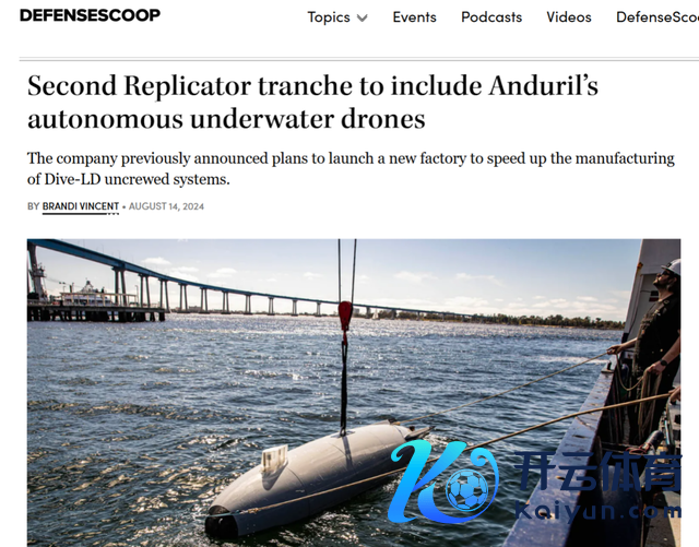 2024年8月,一直慈祥军方采购、时势开采等情况的防务独家(DefenseScoop)网站报谈称,据匿名音讯东谈主士表示,Dive-LD已在好意思国舟师先进海底系统时势办公室(PMS394)的保举下入围了“复制器”计算的第二阶段(Replicator1.2)。